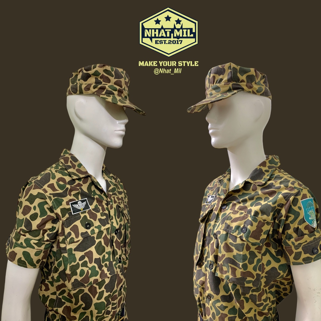 Locally produced versions of commercial duck-hunter jacket patterns introduced by U.S. military advisors in 1961 began to be manufactured around 1964. The Vietnamese name for this pattern is beo gam (“leopard”), so called because the spots in the pattern resemble those of a leopard. Although several variations exist, most beo gam patterns produced in Vietnam can be distinguished from those purchased from commercial sources in the United States or elsewhere in Asia by their denser concentration of spots. A typical beo gam pattern is a multicolored design featuring dark blue, green, lilac, maroon, deep pink, and olive spots on a khaki background. This was not a standard uniform for any unit of the Army of the Republic of Vietnam; instead, it was primarily used by Montagnard Civilian Irregular Defense Group (CIDG) units.