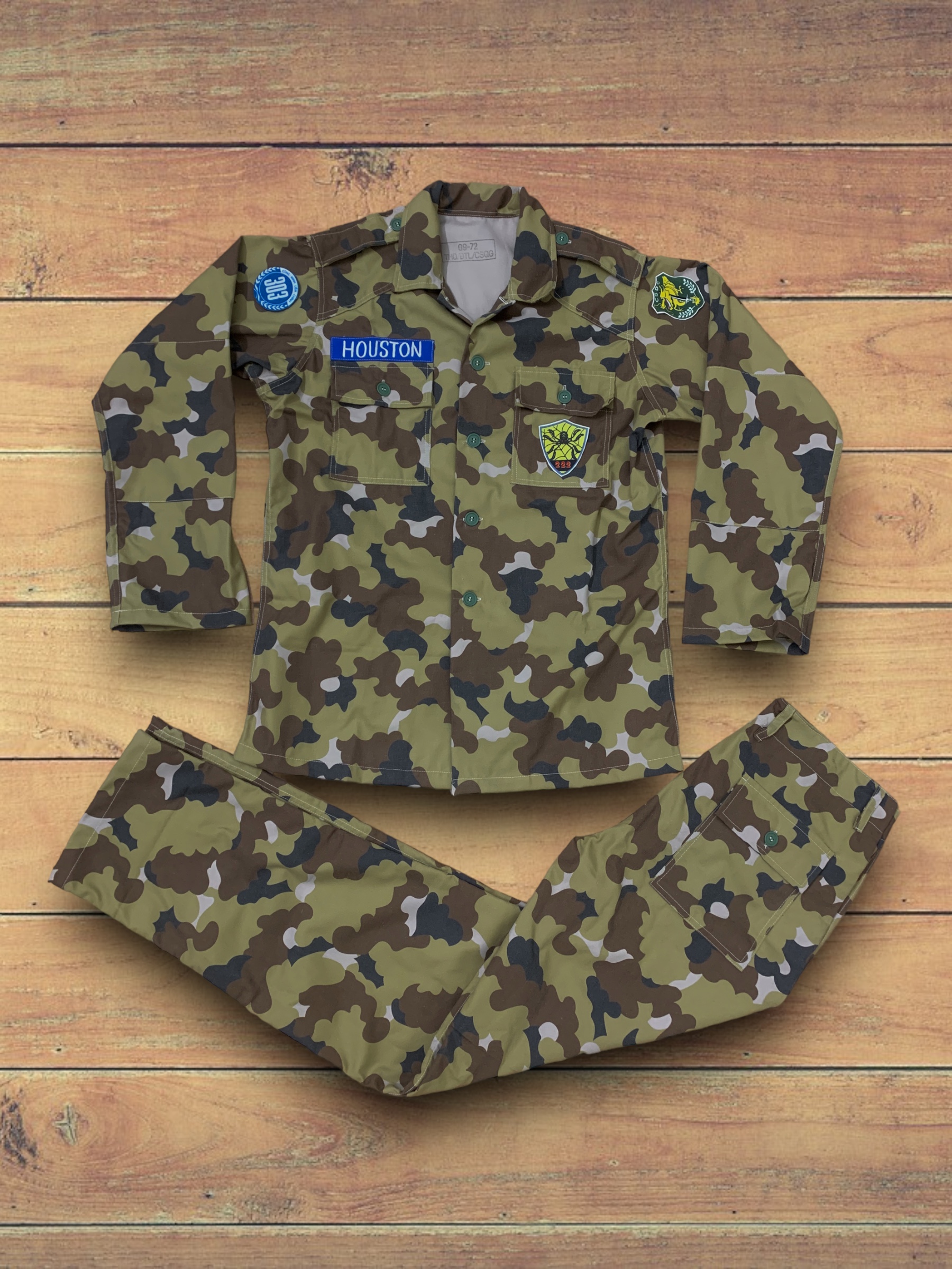 - A Vietnamese-produced copy of the US-designed “Mitchell” (or “clouds”) camouflage pattern was worn by the National Police Field Force (NPFF) from 1967 until the end of the war. Nicknamed Hoa Mâu Dât (earth-colored flower) pattern, this design is also sometimes referred to as “leopard” pattern, not to be confused with the Beo Gamdesign (see above) which was also known by this English term. The design incorporates overlapping dark brown, russet, beige, light brown & ochre “cloud” shapes on a tan background. Some versions are much lighter colored than others.